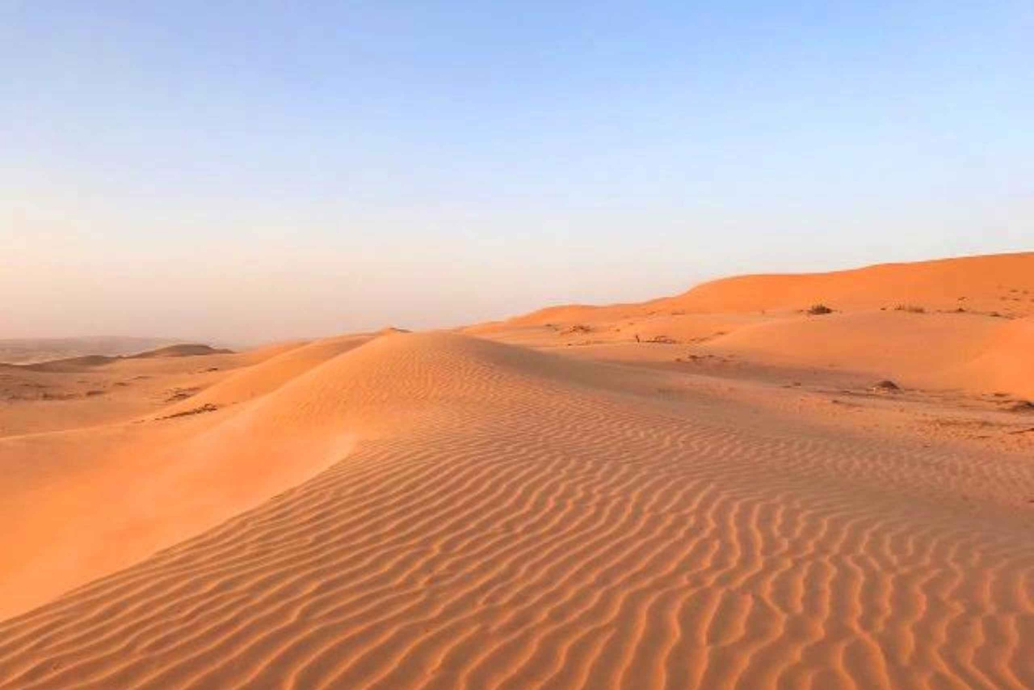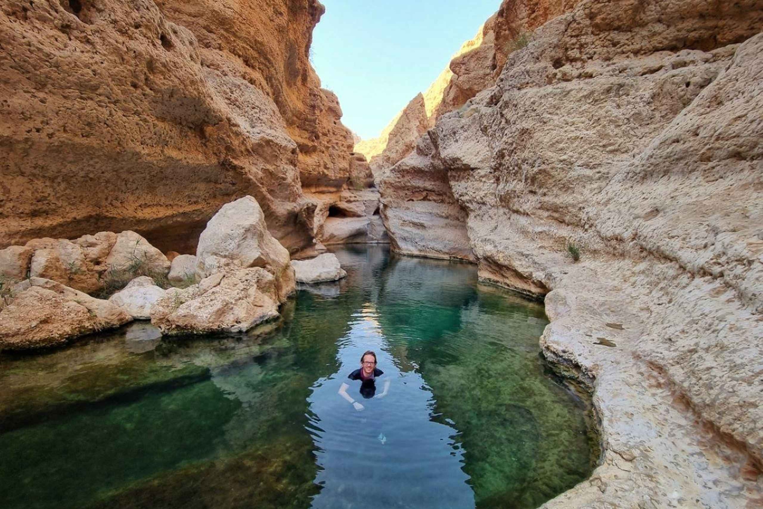 اليوم الأول مسقط - حفرة بيما - شاطئ فينس - وادي شاب - سور - رأس الحد تنطلق الجولة من مسقط في الصباح باتجاه رأس الحد، محطتنا الأولى حفرة بيما (السباحة في بحيرة الحفرة ممكنة) حفرة بيما هي منخفض مملوء بالمياه، وهو عبارة عن حفرة هيكلية، في الحجر الجيري في محافظة مسقط الشرقية في عمان، وهي بحيرة من المياه الفيروزية، يبلغ عرضها 50 مترًا في 70 مترًا وعمقها حوالي 20 مترًا، تشكلت الحفرة نتيجة لانهيار الطبقة السطحية بسبب تحلل الحجر الجيري الأساسي. من حفرة بيما سنتوقف عند شاطئ فينس أو ما يطلق عليه الناس شاطئ الرمال البيضاء الذي يفتح بانوراما من الرمال البيضاء المذهلة والشاطئ المليء بالحصى بشكل مثير للاهتمام، مع المياه الفيروزية المتلألئة والنسمات الباردة الناعمة. ثم نتجه نحو وادي شاب، وهو عبارة عن مضيق ضخم محاط بأشجار النخيل ومؤشرات رائعة على ما يمكن أن تفعله قوة المياه القادمة من الجبال في الطبيعة، حيث نسير لمدة 35 إلى 40 دقيقة عبر وادي شاب (يُطلب ارتداء أحذية المشي)، ونصل إلى أحد أحواض المياه الصافية، حيث يمكن للسياح السباحة عبر المياه الدافئة من حوض إلى آخر، وفي النهاية، نصل إلى آخر حوض حيث تسمح لنا فتحة بين الصخور الضخمة بالسباحة إلى كهف شق مذهل مع شلال صغير بالداخل، حيث تتسرب أشعة الشمس من الخارج. تستمر الجولة إلى مدينة صور، ومصنع الداو العربي الشهير، حيث يمكنك رؤية الداو الخشبية التقليدية التي يتم بناؤها، وسنزور الجزء القديم من صور حيث يمكنك رؤية معظم المنازل هناك المصممة بأبواب ونوافذ خشبية. من صور نتجه نحو رأس الحد، ونقوم بتسجيل الوصول في الفندق/المنتجع، وفي المساء بعد العشاء نأخذك إلى محمية السلاحف في رأس الجنز، حيث سننطلق في جولة سير جميلة بصحبة مرشد على الشاطئ ليلاً تحت النجوم، حيث لدينا فرصة كبيرة لرؤية السلاحف البحرية العمانية العظيمة وهي تتعثر على الشاطئ لبناء عش ووضع البيض، وإذا كنت محظوظًا، يمكنك حتى رؤية صغار السلاحف تفقس من الأعشاش. المبيت في رأس الحد (منتجع تيرتل بيتش أو ما شابه) اليوم الثاني رأس الحد - وادي بني خالد - رمال وهيبة - مسقط اليوم نتجه بالسيارة إلى وادي بني خالد، أحد أكبر وأجمل الوديان في عمان، بعد الوصول إلى وادي بني خالد على بعد مسافة قصيرة سيرًا على الأقدام لمدة 10 دقائق تقريبًا (يُطلب ارتداء أحذية المشي)، سترى بركًا من المياه الزرقاء الصافية المتلألئة بعمق 9 أمتار مثالية للسباحة الطويلة وحمامات الشمس المريحة في وادي كانيون الخلاب. في فترة ما بعد الظهر نواصل رحلتنا إلى الصحراء (رمال وهيبة) هذه الصحراء المذهلة تبلغ مساحتها 12500 كيلومتر مربع وتسمى أيضًا رمال الشرقية، والمعروفة سابقًا باسم 'رمال وهيبة' وهي منطقة صحراوية في عمان سميت المنطقة باسم قبيلة بني وهيبة، مقسمة بين المحافظات الشمالية والجنوبية في المنطقة الشرقية، وتحدد المنطقة بحدود 180 كم (110 ميل) من الشمال إلى الجنوب و 80 كم (50 ميل) من الشرق إلى الغرب، استمتع بالرمال الذهبية واستمتع بكثافة الكثبان الرملية مع مرشدنا ذي الخبرة.Includes