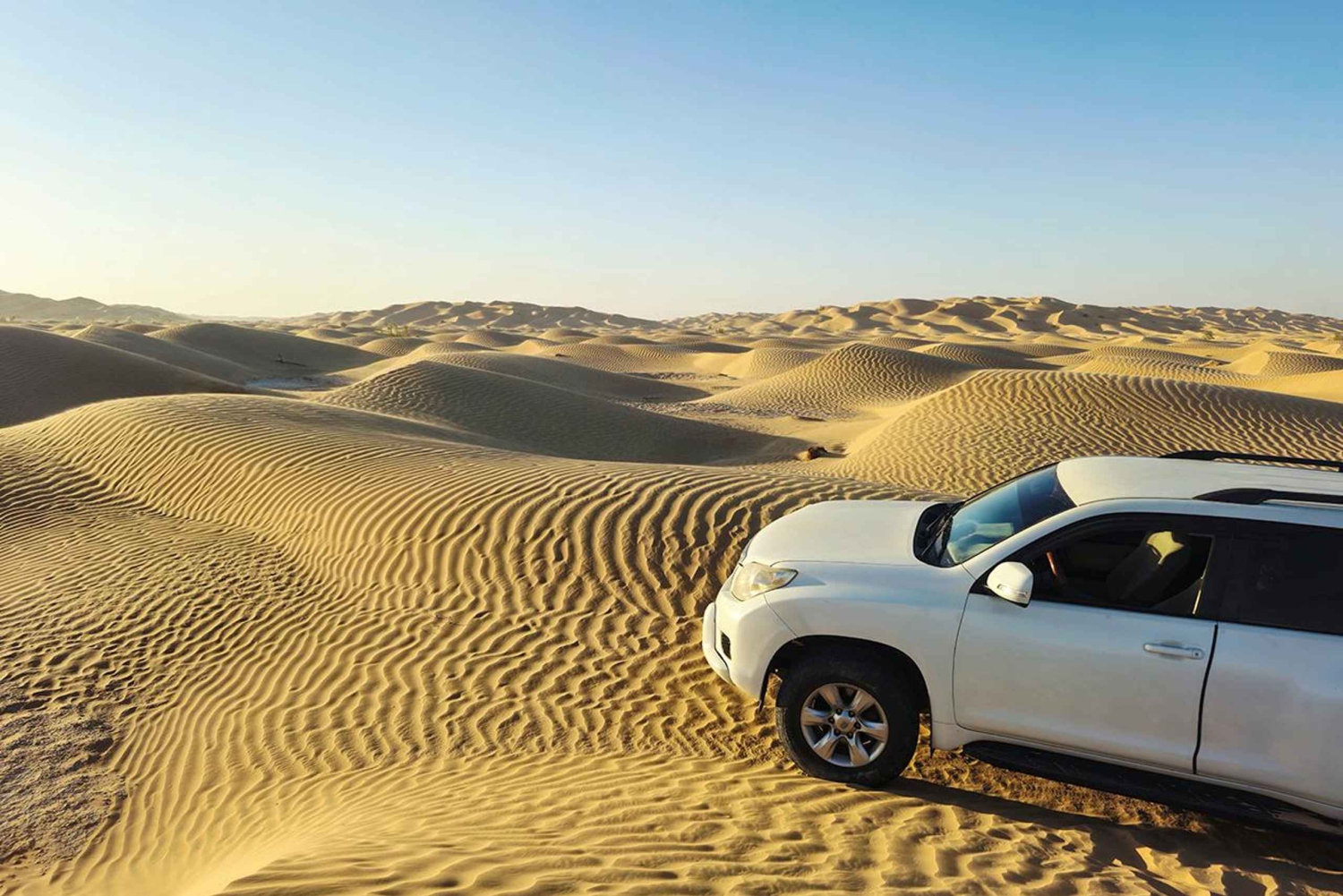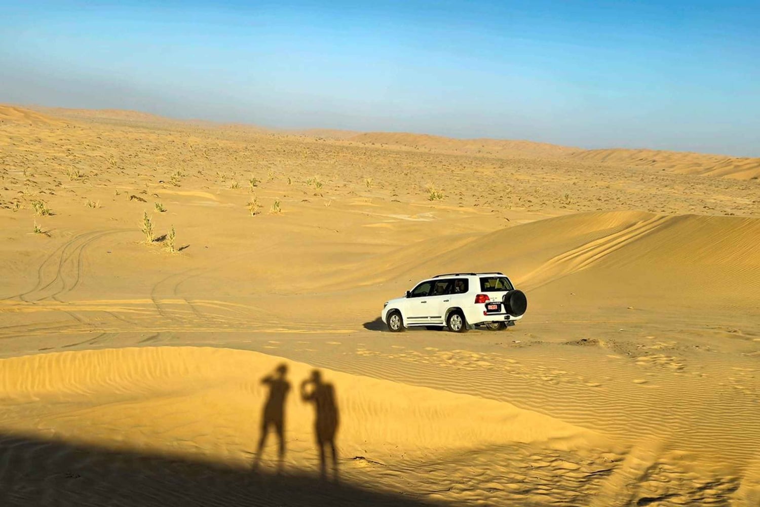 ابدأ رحلتك بزيارة عين رزات، أحد أجمل الينابيع الطبيعية في صلالة. تجوّل في حدائقها الهادئة واستمتع بالممرات المظللة والهادئة المحاطة بالمساحات الخضراء — مقدمة هادئة قبل التوجه إلى الصحراء. تابع إلى وادي الدكة، وهو موقع تراث عالمي بحسب اليونسكو يشتهر بأشجار اللبان التي يعود تاريخها إلى قرون. تعرّف على العلاقة العميقة للمنطقة بتجارة البخور القديمة واستمتع بالمناظر الطبيعية الشاسعة التي تنتشر فيها أشجار البوسويليا ساكرا. استرخ واستمتع بوجبة غداء تقليدية في ثمريت، وهي بلدة صحراوية كان يعيش فيها البدو. توفر هذه المحطة فرصة لإعادة شحن طاقتك قبل دخول المناطق الصحراوية الأعمق. بعد ذلك، استكشف الموقع الأثري في أوبار، الذي يُطلق عليه غالبًا اسم 'أتلانتس الرمال'. اكتشف الأساطير والتاريخ المحيط بهذه المدينة القديمة للقوافل، التي يُعتقد أنها اختفت تحت رمال الصحراء لعدة قرون. تستمر مغامرتك وأنت تقود سيارتك في الربع الخالي الشهير عالميًا، أكبر صحراء رملية على وجه الأرض. استمتع بالانتقال الساحر من السهول الصخرية إلى الكثبان الرملية الذهبية الشاهقة. اشعر بصمت واتساع الربع الخالي. يقدم هذا الجزء من الرحلة مناظر صحراوية مثيرة، وآفاق لا نهاية لها، والهدوء الفريد الذي لا يمكن أن توفره سوى الصحراء العميقة. استمتع بفرص متعددة لالتقاط لحظات لا تُنسى — من مناظر الكثبان الرملية البانورامية إلى التكوينات الصحراوية المذهلة. سيأخذك مرشدك إلى أفضل المواقع ذات المناظر الخلابة لالتقاط صور مذهلة حقًا.Includes