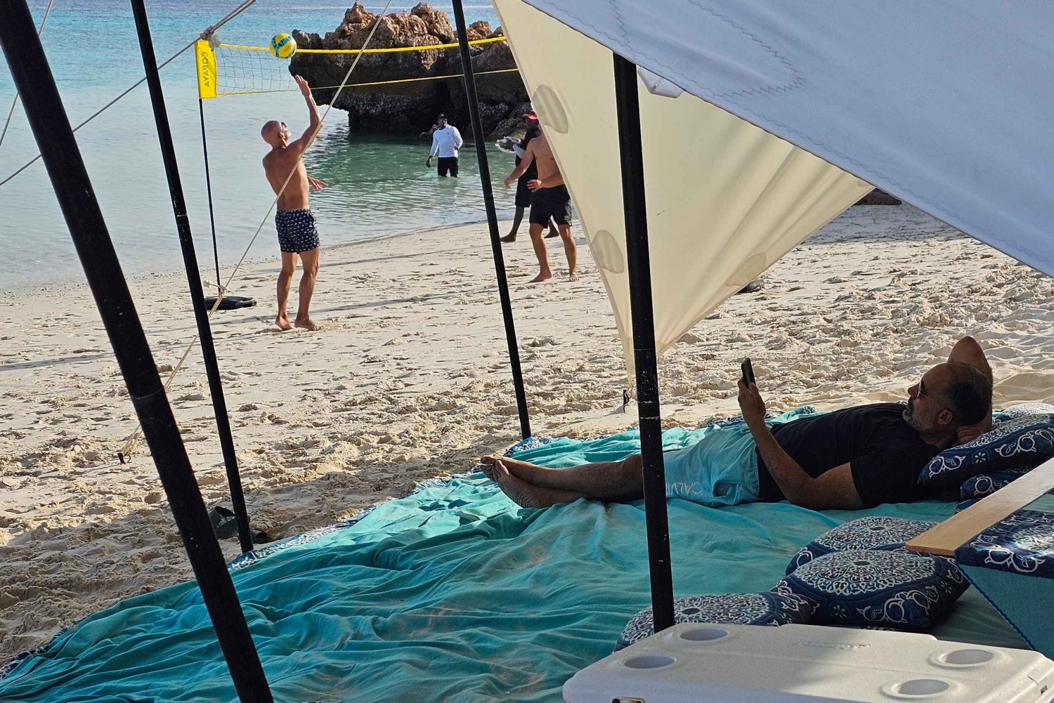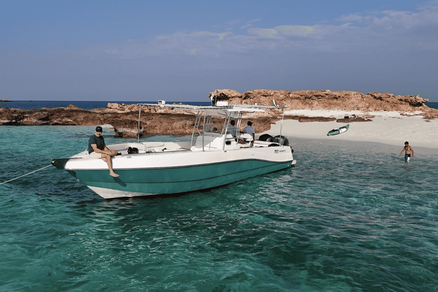 Your trip includes: Premium Snorkeling Gear: High-quality masks, fins, and snorkels for the best underwater experience. Luxury Beach Setup including shaded seating, comfortable cushions, and Instagram-perfect arrangements. Gourmet BBQ Dinner Our signature '3 Flavors of Oman' barbecue prepared fresh on the beach. Tents for overnight camping on white sandy beaches, just steps from the crystal clear waters Snacks, beverages, all meals Beach Volleyball Underwater Photoshoot: Complimentary underwater photography with the latest GoPro Camera. Boat transport to the Islands: Aboard FULLA, our 38 foot center-console powerboat driven by twin four-stroke outboardsImportant Information