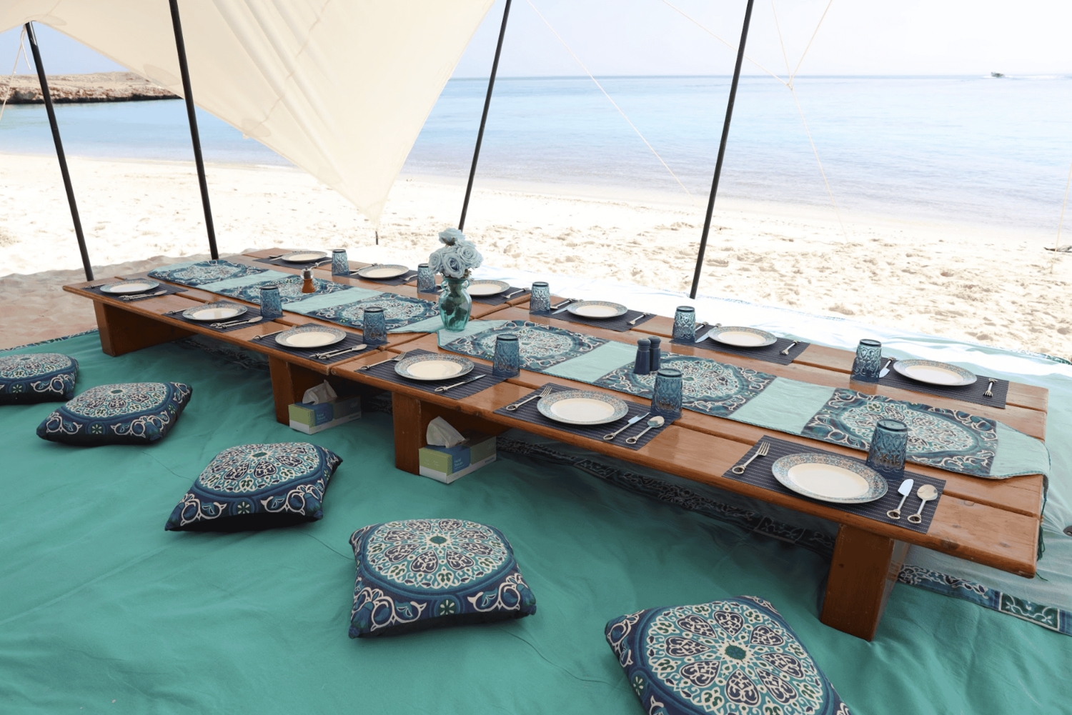 Welcome to Daymaniyat Experts – The Best Way to Experience the Daymaniyat! We pride ourselves on providing truly exceptional experiences to the Daymaniyat Islands, crafted from years of hands-on exploration and deep local knowledge. Our overnight camping trips are carefully timed to avoid peak hours and ensure you enjoy the islands without the crowds. What makes us truly special is our attention to detail and thoughtful planning. Our trips include premium snorkeling gear, experienced guides who know every hidden spot, GoPro cameras for you to capture unforgettable moments, comfortable shaded beach setups, and freshly prepared barbecue meals right on the beach at beautifully set tables, and lush cushions for informal yet comfortable seating. Our dining tent is festively lighted at night creating just the right atmosphere for family, old and new friends. Enjoy swimming alongside turtles, kayaking in clear waters, or simply relaxing on untouched sands in peace and quiet. No one does the Daymaniyat like us! Join us to discover why our guests keep coming back, and experience the islands exactly as they should be – unspoiled, relaxing, and unforgettable. Please arrive 20 minutes before the departure time. Our staff will be greeting you at our sales kiosk in Al Mouj Marina. You will be returned to the same location by 10:00am the next morning. Comfortable clothing, beach attire, sunglasses, sunscreen, and a hat are recommended.Includes