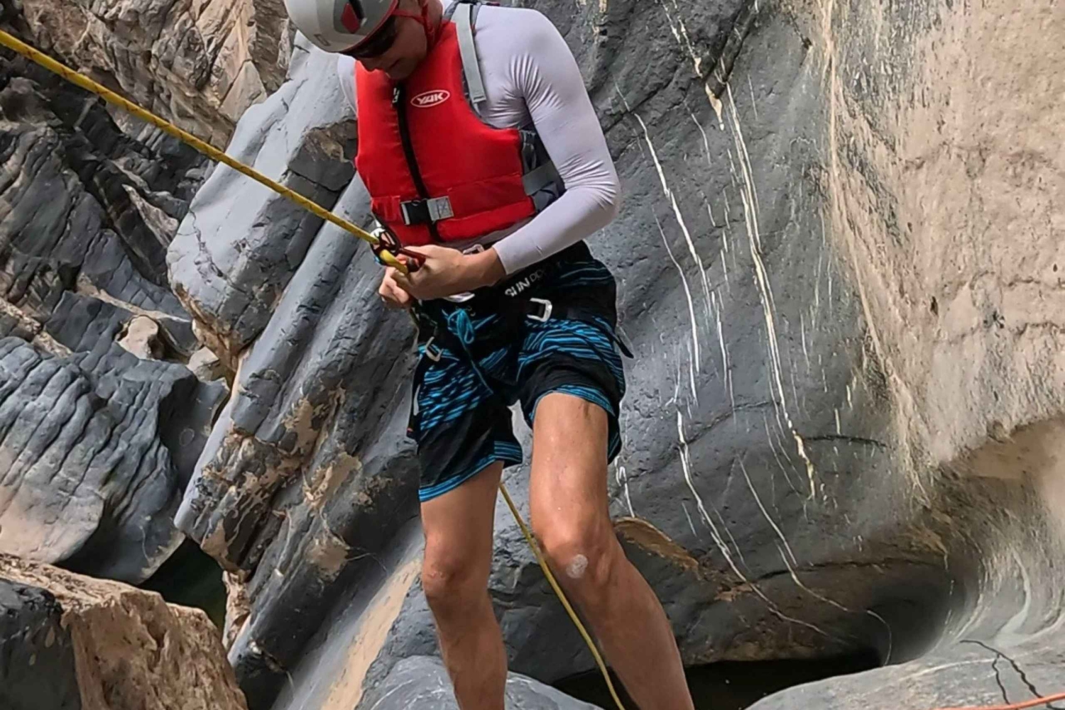 Embark on a canyoning adventure in Wadi Al Thahabayn (Snake Canyon) designed for those who love outdoor challenges. This is not a sightseeing tour, but an active canyoning journey that requires engagement, focus, and endurance. Begin with a safety briefing and gear up for the adventure. Head into the canyon, covering approximately 4 km of rugged terrain. Walk on uneven rocky surfaces, navigate narrow gorges, wade through water, swim in natural pools, and complete three technical abseils. The canyoning route includes three abseils of varying heights, carefully planned to provide a progressive adventure experience: The first abseil (7 meters) serves as a warm-up descent, allowing participants to refresh their technique and gain confidence. The second abseil (27 meters) is the main highlight and most demanding descent, requiring focus, controlled movement, and comfort with heights. The third abseil (8 meters) completes the route with a final controlled descent before exiting the canyon. Throughout the activity, professional local guides provide supervision, rope setup, and safety support. Participants are expected to actively follow instructions, communicate clearly, and demonstrate responsibility for their own movement within the canyon. The overall difficulty level is medium, making it suitable for fit and adventurous travelers with basic abseiling experience. The total duration of the activity is approximately 4 to 6 hours, depending on group size, pace, and water conditions. This includes walking, swimming, abseiling, rest stops, and time for safety checks.Includes