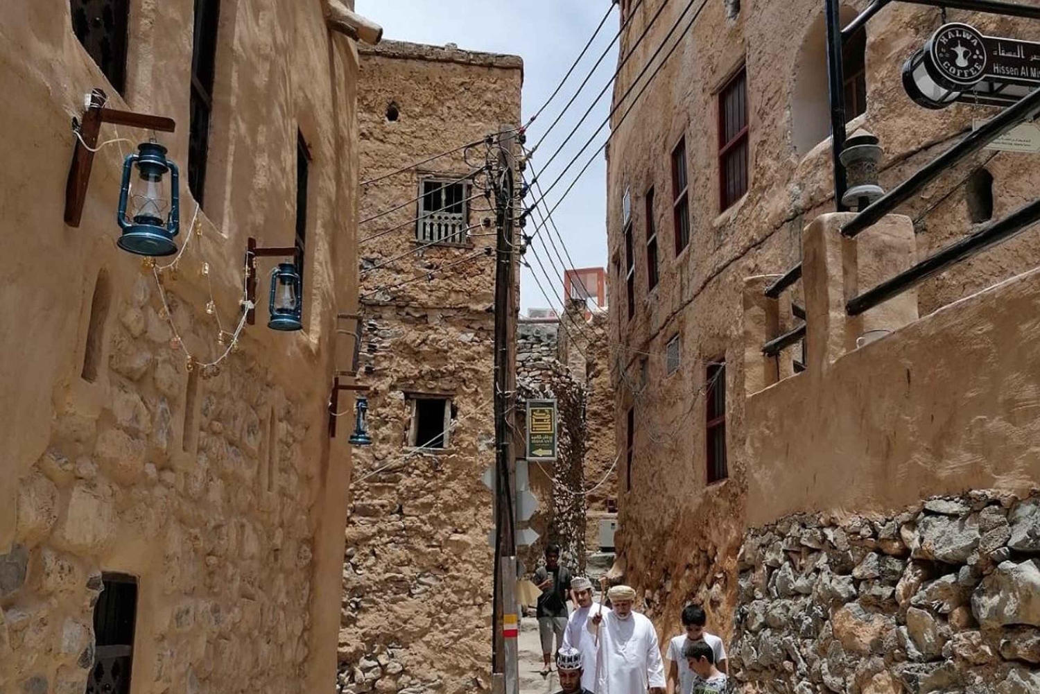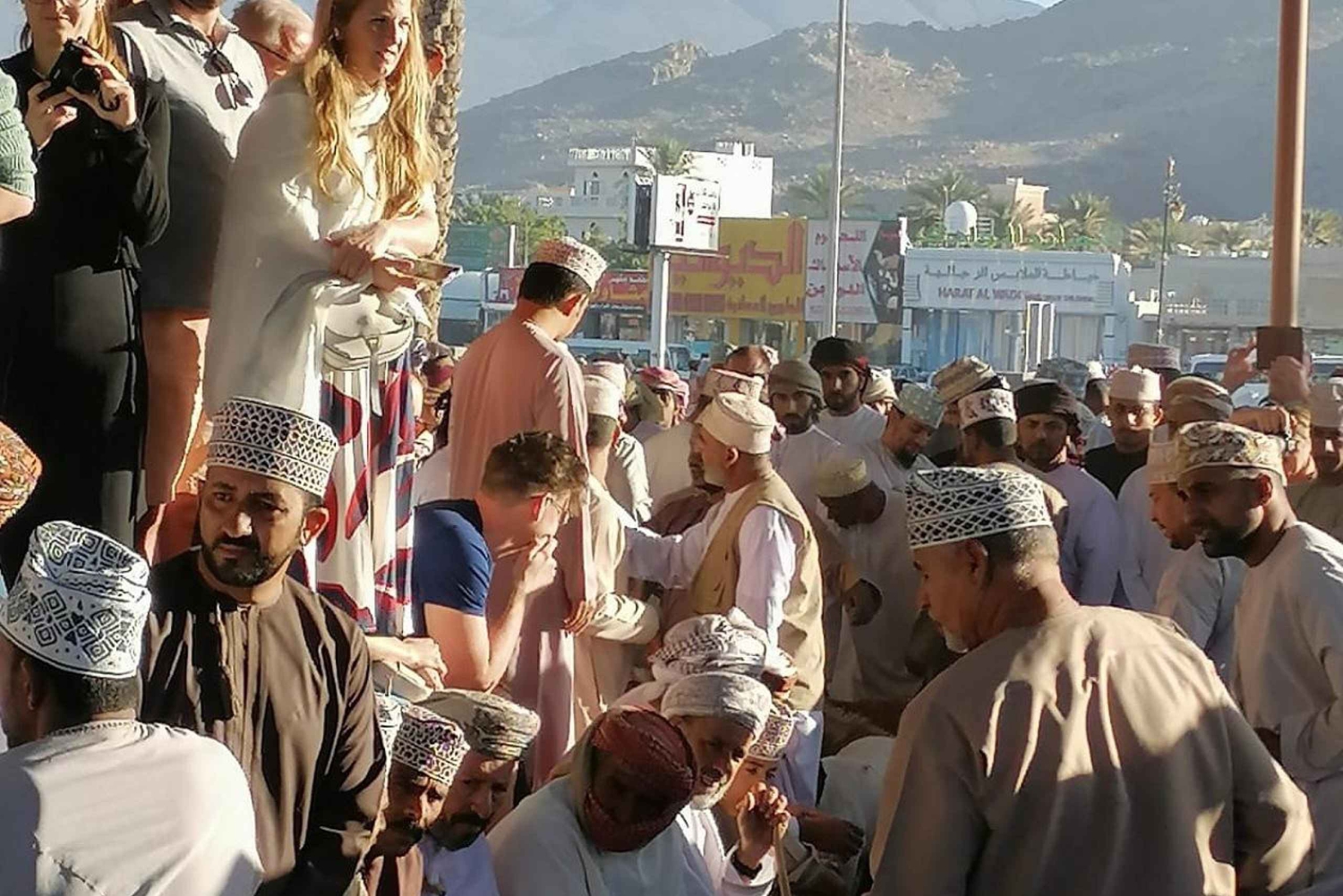 Opastettu historiallinen kulttuurikierros Muscatista Nizwaan, jossa on kuuluisa perinteinen souk ja suuri linnoitus, ja sen jälkeen kävely kauniissa kylässä (Misfat Al-Abriyeen) kauniiden maatilojen ja vanhojen talojen välissä.