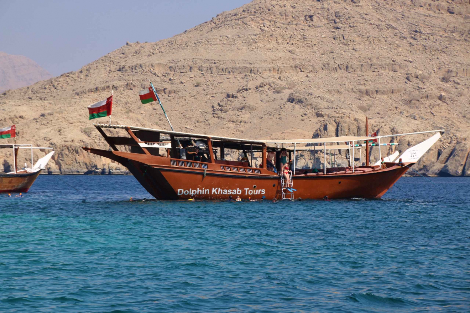 Nouto Khasabin sataman risteilyalusterminaalista tai Khasabin lentokentältä. Lounasbuffet, hedelmiä, kylmiä juomia, teetä ja kahvia. Delfiinien katselu ja uinti Telegraph Islandilla ja Seebi Islandilla.