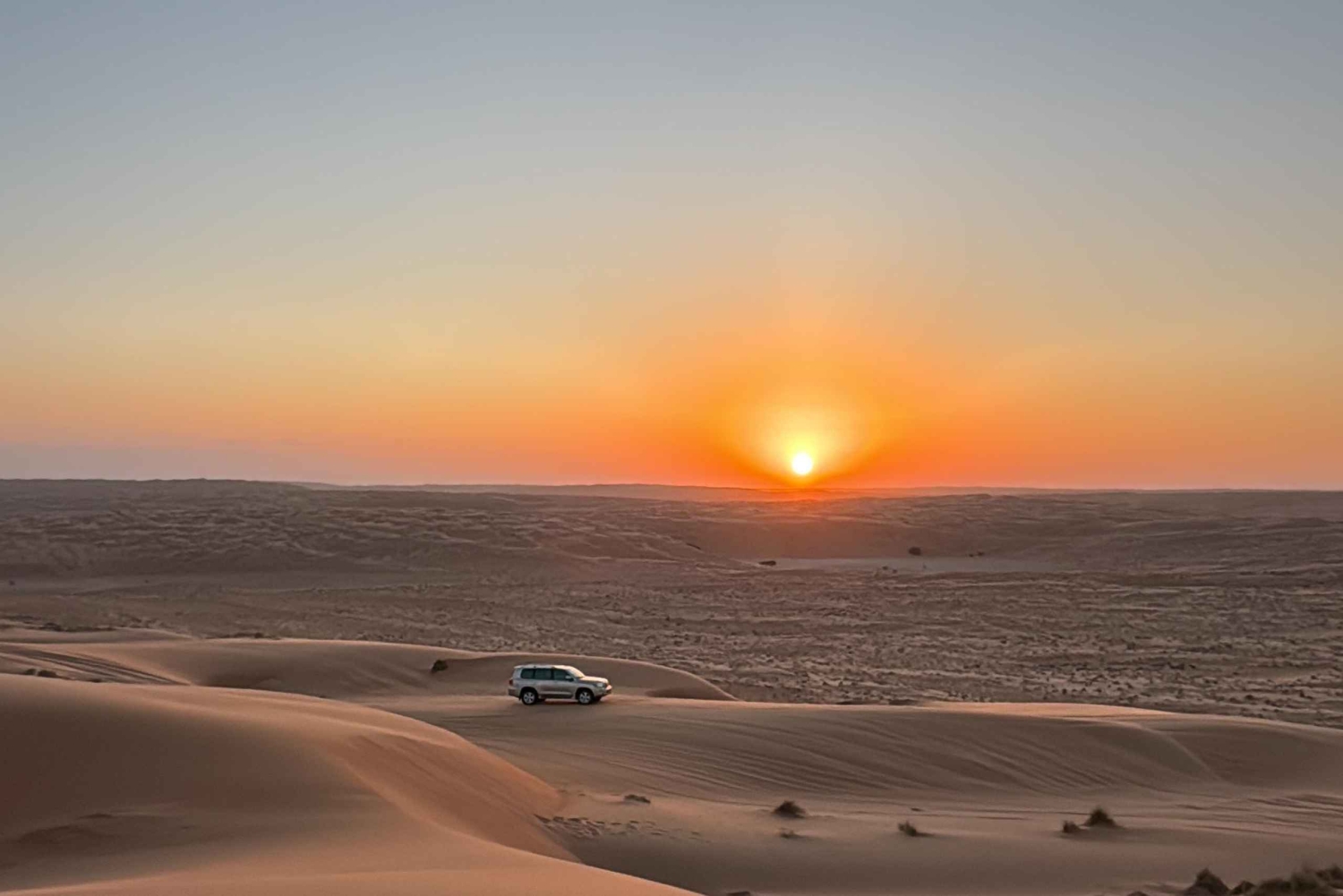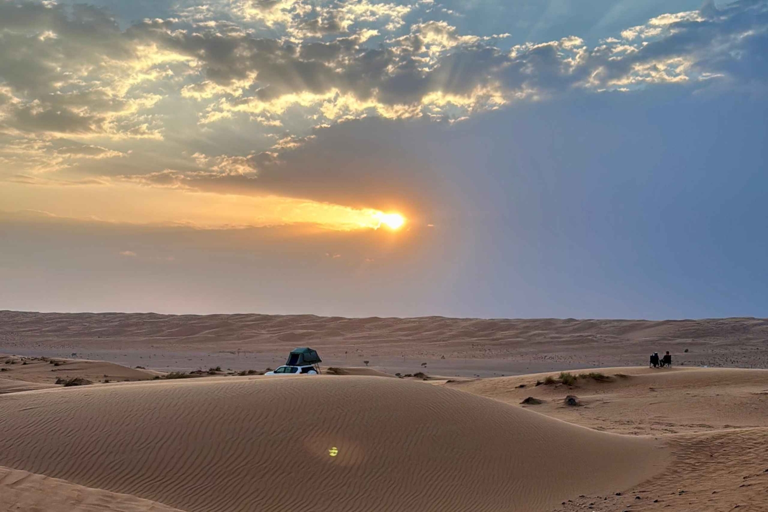 Le voyage commence par une visite de l'oued Bani Khalid, où vous pourrez profiter de l'eau turquoise, des formations rocheuses fascinantes et de la nature luxuriante. Vous aurez ici l'occasion de découvrir la qualité de l'eau claire, de vous détendre et de vous imprégner de l'environnement paisible. Le voyage se poursuit ensuite dans le désert doré sans fin, avec ses dunes de sable douces et majestueuses, où vous pourrez admirer le coucher de soleil à couper le souffle. Cette excursion combine aventure, expérience de la nature et moments photographiques inoubliables dans un cadre unique.Includes
