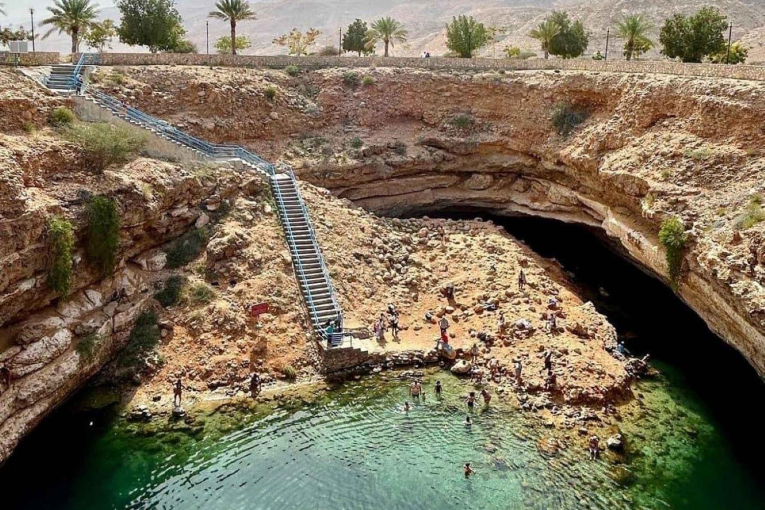 マスカットからの1日ツアーで、スルタン・カブース・グランド・モスク、ワディ・シャブ、フィンズ・ビーチ、ビマ・シンクホールを発見しましょう。ワディ・シャブの透き通った海で泳ぎ、洞窟を探検しましょう。