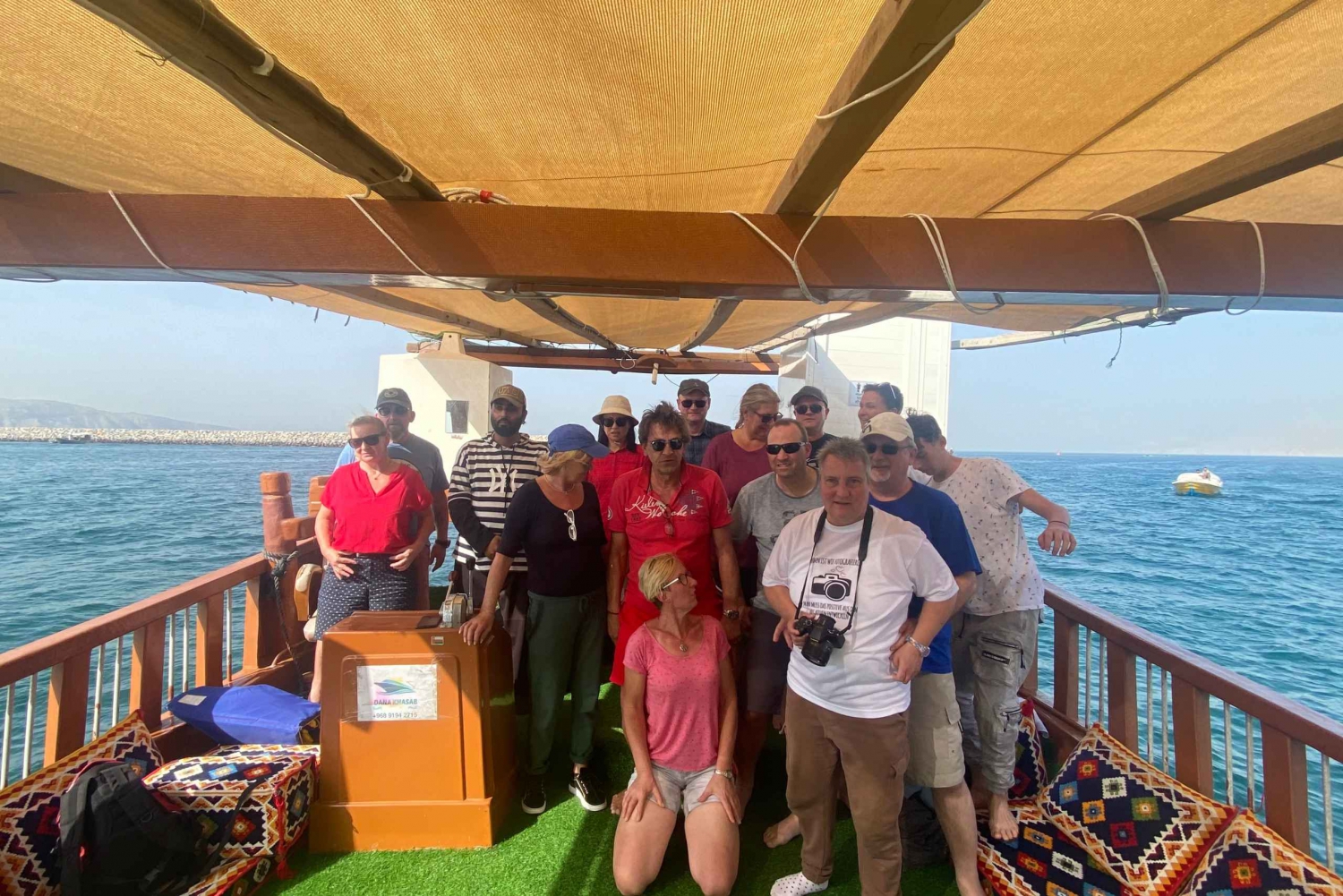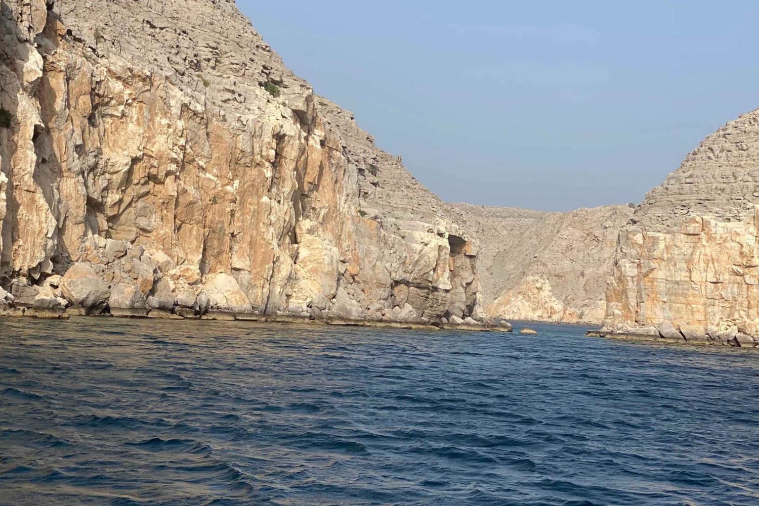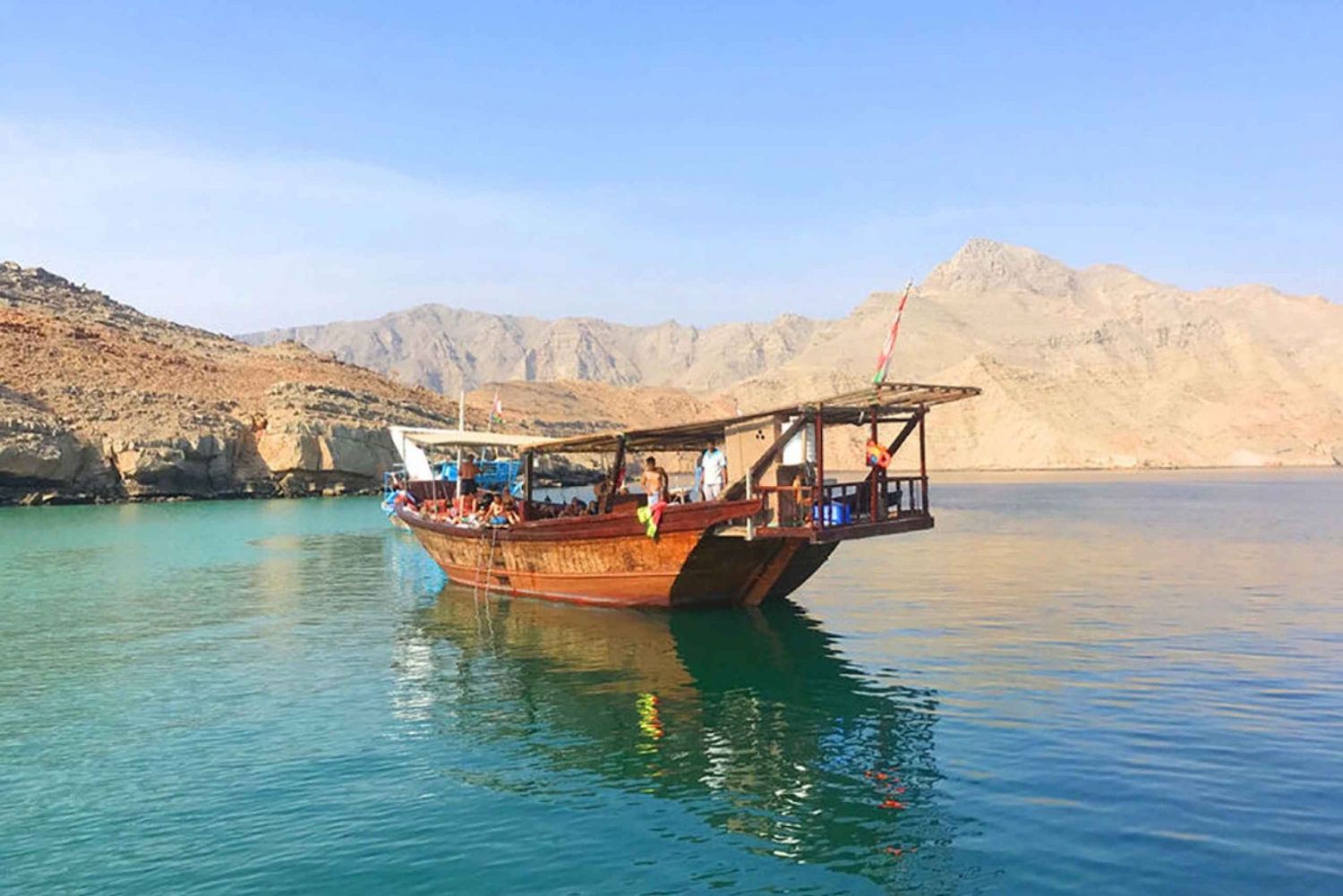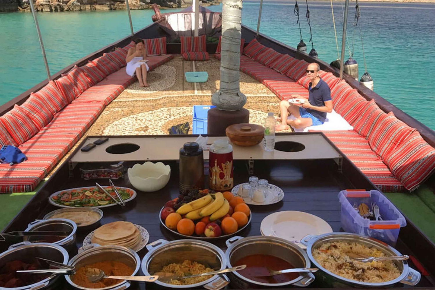 Podczas tej wycieczki z Khasab rejs do fiordów Musandam o nazwie Khor Sham na pokładzie tradycyjnie zdobionego omańskiego dau. Żegluj obok wysokich szczytów górskich, nurkuj w krystalicznie czystej wodzie Telegraph Island z kolorowymi rybami i obserwuj rafy koralowe. Istnieją dwa przystanki do pływania i nurkowania. Zapewniamy sprzęt do nurkowania i ręczniki. Jest toaleta/przebieralnia oraz prysznic ze słodką wodą, z którego można skorzystać po kąpieli w morskiej wodzie. Będziesz cieszyć się pysznym lunchem w formie bufetu z wodą mineralną, sokiem, napojami bezalkoholowymi, różnorodnymi owocami, daktylami, herbatą i kawą.Includes