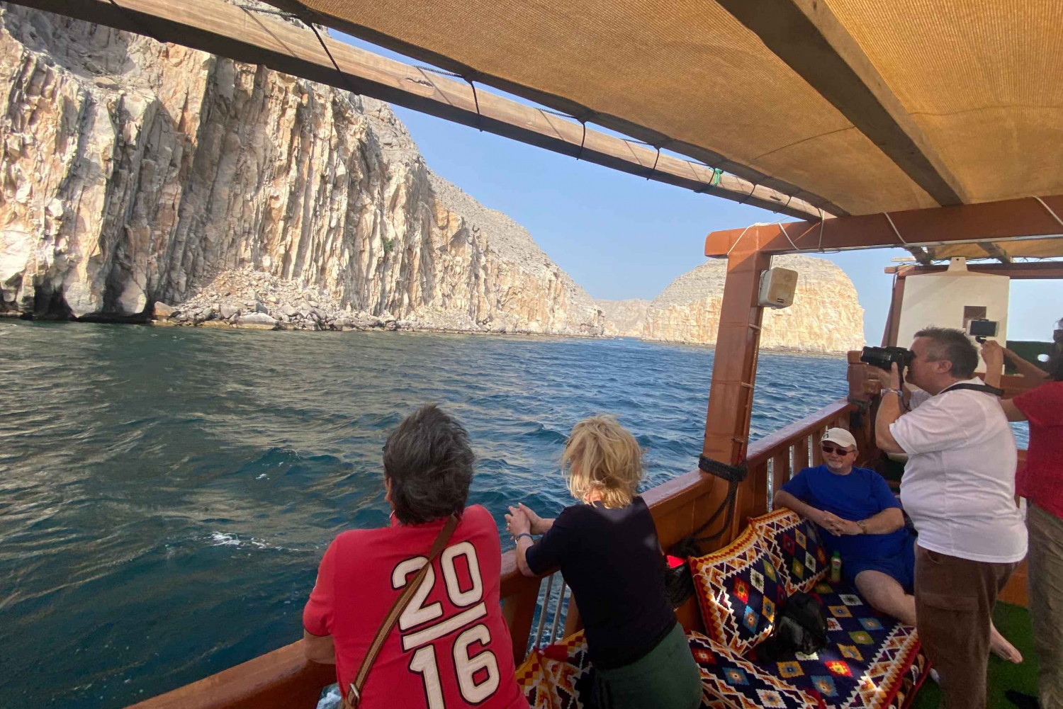 2 ReviewsPopłyń do fiordów na pokładzie omańskiej łodzi dhow. Przepłyń obok wysokich szczytów górskich, nurkuj ze sprzętem w pobliżu krystalicznie czystej wody Telegraph Island z kolorowymi rybami i rafami koralowymi i zjedz lunch.